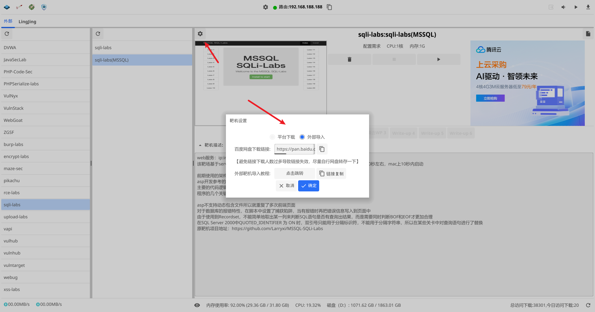 缩略图的坐上角和右上角有一个按钮,左上角可以从外部导入靶场,在线下载缓慢时可以从百度网盘下载进行导入。